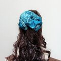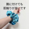柔らかく手触りの良い生地で、発色の良いブルーの光沢・鮮やかな白い模様が美しいシュシュです。