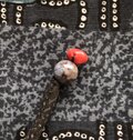 中綿を入れ、大島紬の正絹の着物で作ったループを付け、ループの先にアクアマリンの玉と山サンゴを付けています。