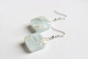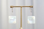優しい水色の背景にお花やパールを配置し、中央に文字を置いたデザインが上品なピアス。(中央の文字は予告なく変更されることがあります)