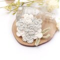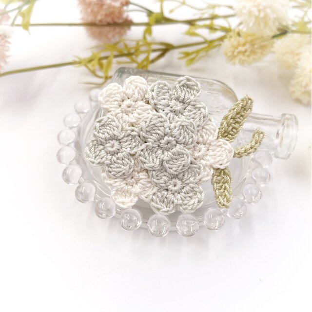 4枚の花弁のお花のモチーフを7枚と、リーフのついたあじさいのブローチです。