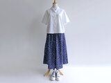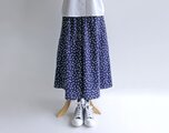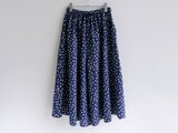 国産のリップル生地を使った爽やかなはき心地のキュロットスカートです。ヴィンテージ調のくすんだネイビーの地にランダムに散りばめられたアイボリーホワイトのドット柄(直径約1cm)は、冬の夜空に降りしきる雪のようで、なんだかちょっと涼しげです!