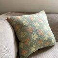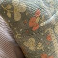優しい若草色ベースに淡いオレンジ色のボタニカル柄、淡いくすんだグリーンの草花模様。ナチュラルだけどちょっと元気で、どこか異国の空気を感じさせるこの表情は、ヴィンテージならではの味わいです。ソファやベッドにさらっと置くだけで、空間がふっと明るく、やわらかくなります。