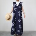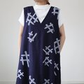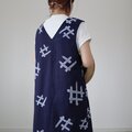 古い浴衣から作ったジャンパースカートです。紺に白抜きの藤の花柄。前後Vネックで体のラインがすっきりと見えます。肩から胸位置にのみ裏地つき。