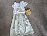 掲載のサイズ スカート丈:最長で、上から下まで約85㎝、丈直しはご相談ください。ウエストはゴムを調整しますので、実寸をお知らせください。