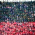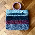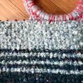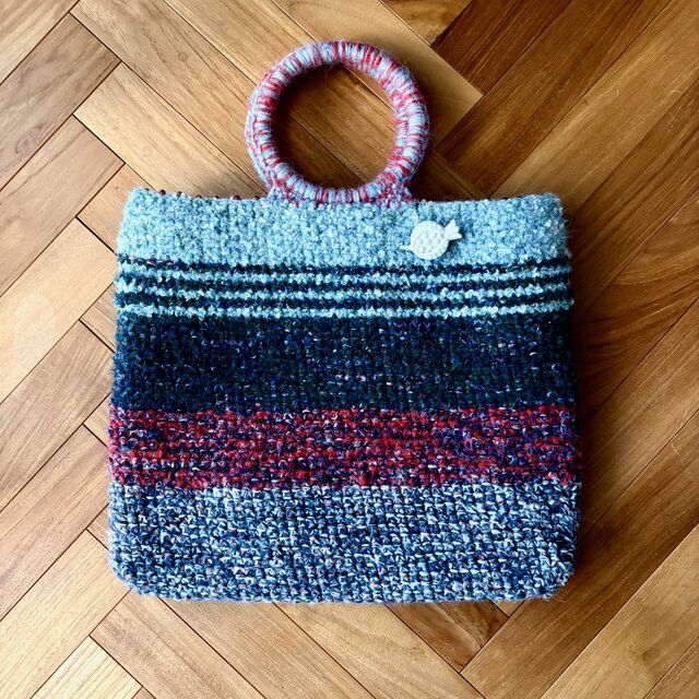 赤、ネイビー、ミントグリーン、たくさんの色んな色の糸で変則ボーダーにトートバッグを編みました。