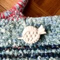 自作の陶器でできた白いザクロのブローチも。