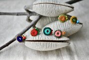 いろいろな色でつくったので、色違いで2つ並べてつけたり、ピアスやイヤリングの色と合わせてつけたり、つけ方いろいろな楽しいアイテムです。