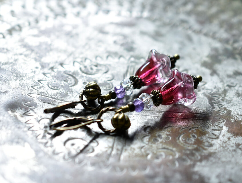 エンジェルトランペットの様なドイツヴィンテージビーズとクォーツ&アメジストなどを繋いだピアスです。