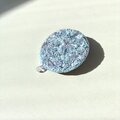 下部には、雫型の神秘的なガラスビーズを一粒つけました。こちらは揺れないタイプです。紫外線により色が変化するビーズです。室内では青色、窓辺にいくうちに紫外線がある場所ではきれいなうすい紫色に変化します。