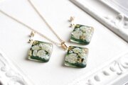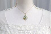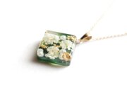 白いお花とパール、金箔を散らし、背景に光沢のあるグリーンをのせた、静謐で爽やかなペンダント。