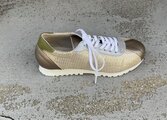 上質なフルレザーを贅沢に使用し、アッパーには繊細なゴールドのメッシュレザー、つま先とヒールにはブロンズ調の光沢レザーを組み合わせた一足。