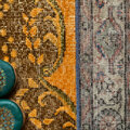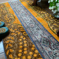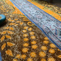 華やかなオレンジのオーバーダイラグとアイボリーにペールピンク、セイジグリーンなどのシックなボタニカルデザインを組み合わせたパッチワークのヴィンテージトルコラグ