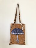 オレンジとブラックのコントラストに描かれた傘のモチーフが印象的なアフリカンファブリックのトートバッグ(M)。