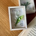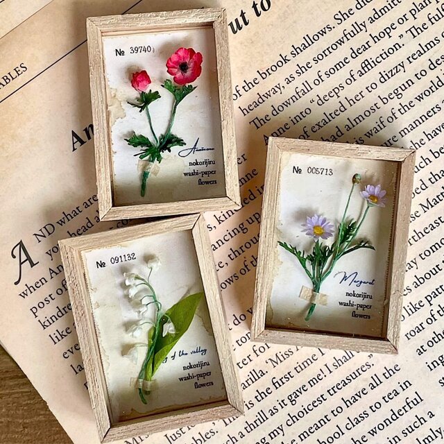 《和紙の花》3種の植物標本箱のミニチュア(薄紫のマーガレット・スズラン・赤いアネモネ)