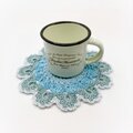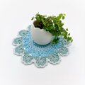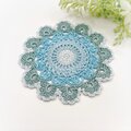 光沢のあるレース糸を4色、色を変えながら編んだお花のドイリーです。