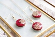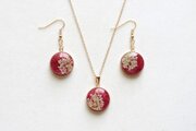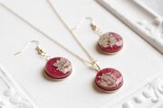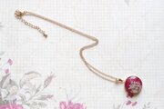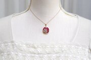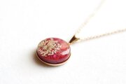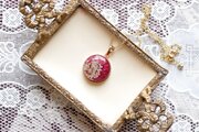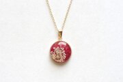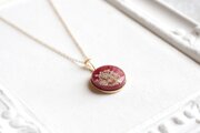 光沢のあるルビーレッドのレジンに白いレースフラワーをあしらった、華やかで大人っぽいペンダント。