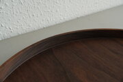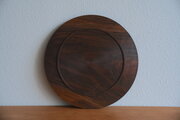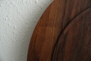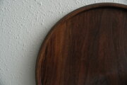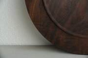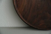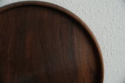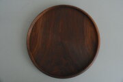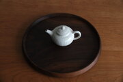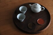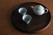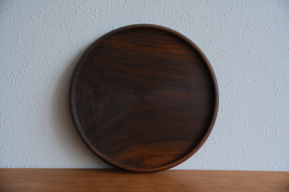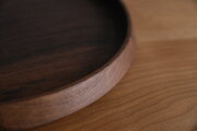 こちらは幅広のウォールナット無垢材を活かした丸盆。藤田さんが中国茶器にも造詣が深く、製作されました。茶器とも相性の良さだけでなく、どことなく西洋、現代を感じさせる形は、洋食器やマグカップも似合いそうです。和洋食器ともに受け止め、今の食卓シーンではお盆としても活躍の幅が広いかと思います。