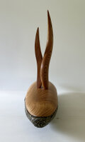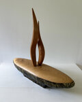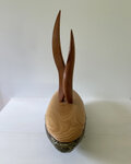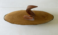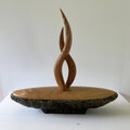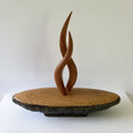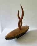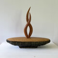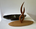 緑色の釉薬が鮮やかで朴訥とした雰囲気のある舟形の器。形も風合も存在感のある器に、スッキリとした淡い色合いの蓋を合わせ、その中央から何かが立ち昇るようなイメージでツマミをまとめてみました。ツマミを2本でまとめていることもあり、見る角度により様々な表情を見せてくれる作品です。