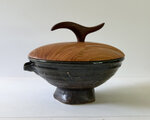 器のフォルムに合わせて、明るめで木目が明瞭なケヤキで蓋を作り、流線型のツマミをつけてまとめました。蓋には段差もつけて動きが感じられます。落ち着いた雰囲気ですが、とても存在感のある作品です。