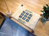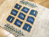 ブルーのかわいらしいパネル柄を散りばめたおしゃれなギャッベです。