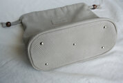 とても柔ららかで落ち着いたサンドグレイの革で作った角丸底巾着です。
