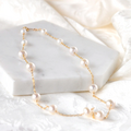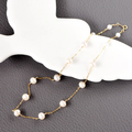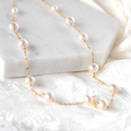 艶やかに輝く約7~7.5mmの淡水パールを、繊細なゴールドチェーンに等間隔で繋いだステーションネックレス。