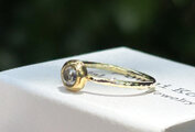 指輪はK18ゴールド、ダイアモンドを留めている石座(側面K22純金製、底K22)、それぞれの金位の持つ特徴を
