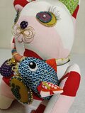 lopnurの招き猫のチャームポイントはやはり目元のビーズ刺繍とつけまつげ。猫の毛色を引き立たせる色合いに。