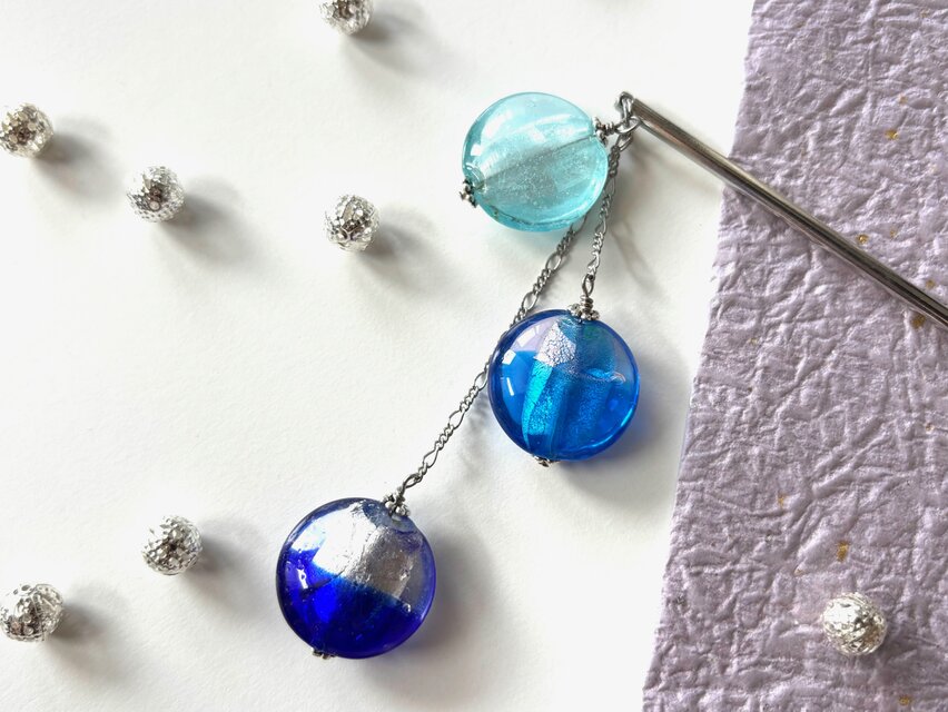 紺色の2トーンカラーのとんぼ玉を3連にしてかんざしを制作しました。
