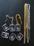 全てカンをお付けしておりますので、お手持ちのチェーンやリボン、ピンなどを通していただけますと