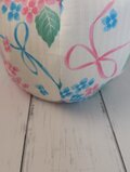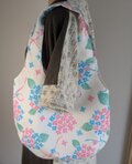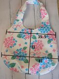うっすらとストライプの織りがある真っ白な生地に青とピンクの紫陽花が映える大きいサイズのバルーンバッグです。