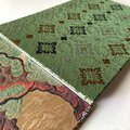 格式高い葵文様が密やかに織り込まれたデザインです。古来より神聖・繁栄・魔を除ける象徴とされてきました。翡翠を思わせる深みある緑地に、オレンジ茶・紫・白の彩りが美しく映え、重厚感と華やかさが絶妙に両立。繊細な織の表情が光を受けて立体的に浮かび上がり、角度によって美しく表情を変える意匠です。格式と美術性、そして祈りの心を同時に纏う特別な一冊にふさわしい裏面です。