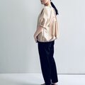 素材は柔らかなサテンで、お色はベージュに近いキャメルです。サテン素材の光沢があり華やかな印象です。