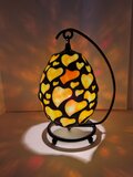この作品は、吊り下げタイプのステンドグラスです。ハートの周りの隙間をハンダで埋めているためランプシェード部はかなり重くなっていますので、動きは鈍いですが、手で触れたり風に吹かれたり(強め)しますと、ステンドグラス部が揺れ、下方部を照らすハート型、壁に映し出された色の光も揺れます。