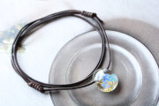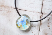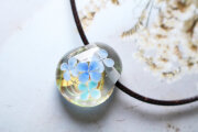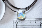 金箔を貼り付けた透明の地に、紫陽花を咲かせたとっても小さなペンダントです。