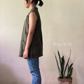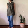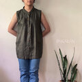 薄手のリネンで仕立てたノースリーブシャツブラウス、シックな深い緑色で作りました。