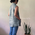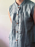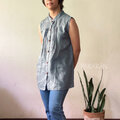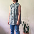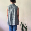 薄手のリネンで仕立てたノースリーブシャツブラウス、合わせやすいライトグレー。