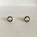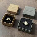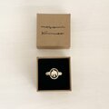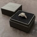 クッション面と箱の高さを揃え、蓋にはサインを黒ツヤ箔押しで配置しました。指輪を綺麗に展示できるインロー式ボックスです。