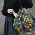 アフリカ布の魅力に実用性を備えたバッグです。裏地に帆布を合わせた丈夫な作りで、荷物を出すと八角形の形になって折りたたむことも可能です。