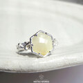 優しい色合いと表面の照りを持つイエローサファイアを、唐草と透かし模様の台座にセットしたリング。