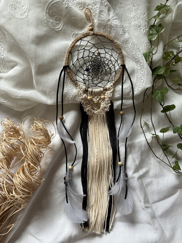 麻、ワイヤー、コットン、フェイクスエード、羽根、木、天然石(アメジスト、クリスタル)