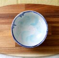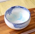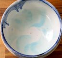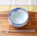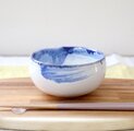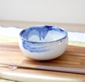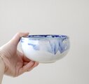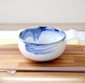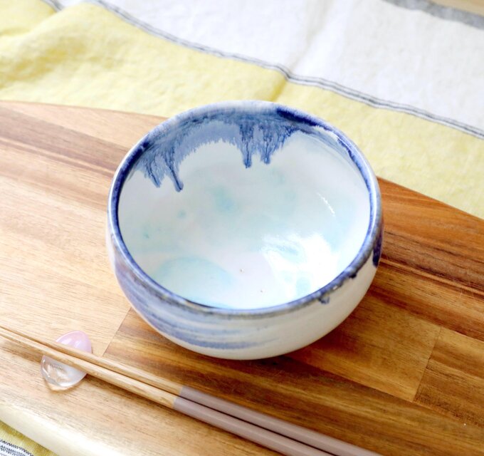 ふっくらと丸い鉢の形に成形し、艶やかな白い釉薬をかけ、二種類のブルーの釉薬で模様を施しました。