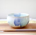 ふっくらと丸い鉢の形に成形し、艶やかな白い釉薬をかけ、数種類の青と緑の釉薬で模様を施しました。