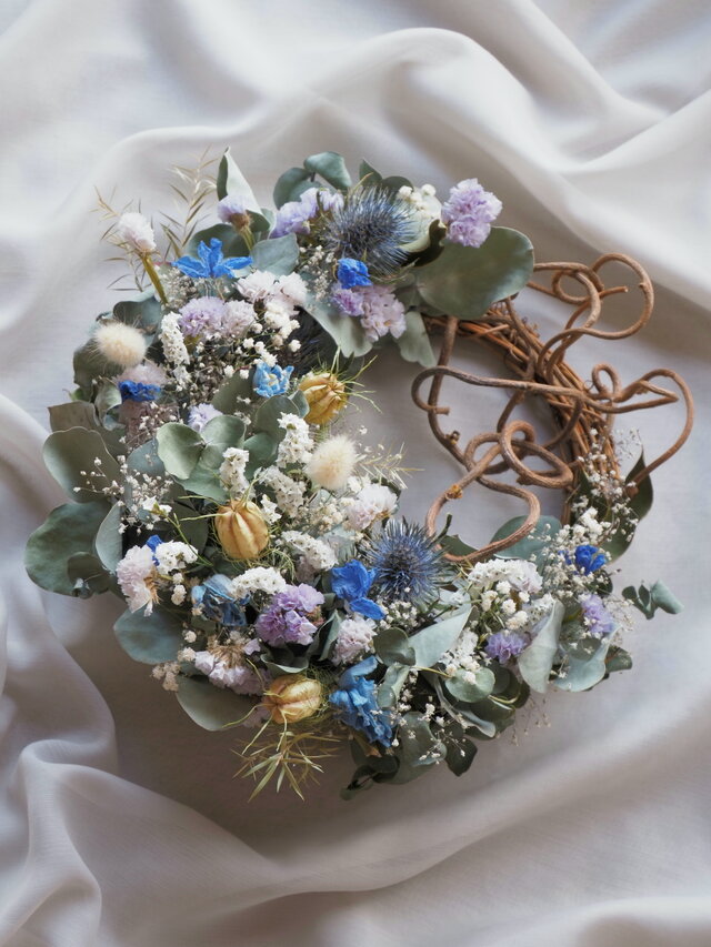 瀬戸内の森で育った爽やかな香り漂うユーカリを立体的に紡ぎ、清涼感ある青色のデルフィニウムとエリンジウムを散りばめ、涼しげな白色の小花を時間を掛けて細かく散りばめ、青く穏やかな瀬戸内海の風景を感じていただけるようなリースに仕立てました。