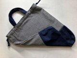 紺ヒッコリーデニム生地に、下の切り替え部分は中厚の紺デニム生地を合わせて作成しました。