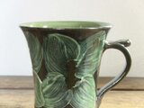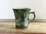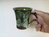 カップに太筆で花模様を描き織部釉を掛けてから焼成しています。