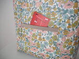 リバティのラミネート生地「Poppy&Daisy」柄と帆布を使い中央にポケットの付いたバッグを作りました。