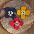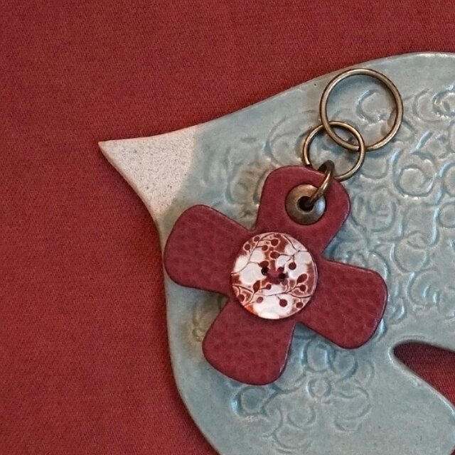 ■イタリアンレザー十字型パーツとフランスの貝ボタンを組み合わせて作りました。