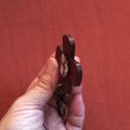 表面に光沢のあるワイン色の花柄が入ったかわいいシェルボタンです。