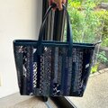 ブルー系の着物生地(古布)をパッチワークしてネイビーの牛革の持ち手を付けて作りました。